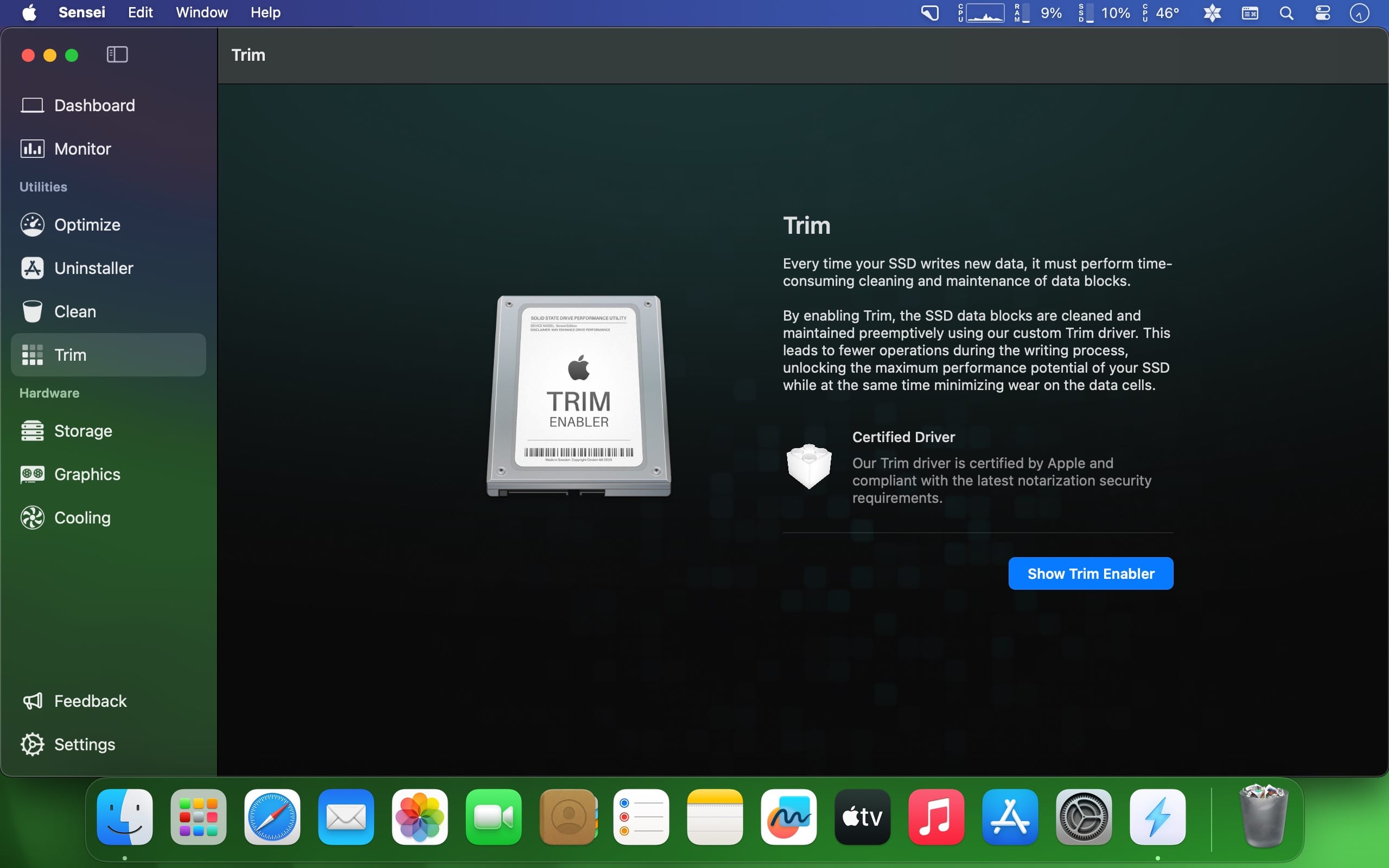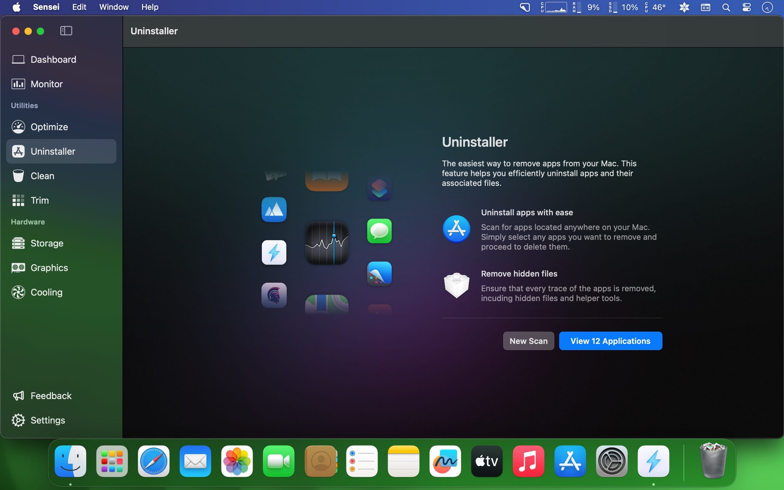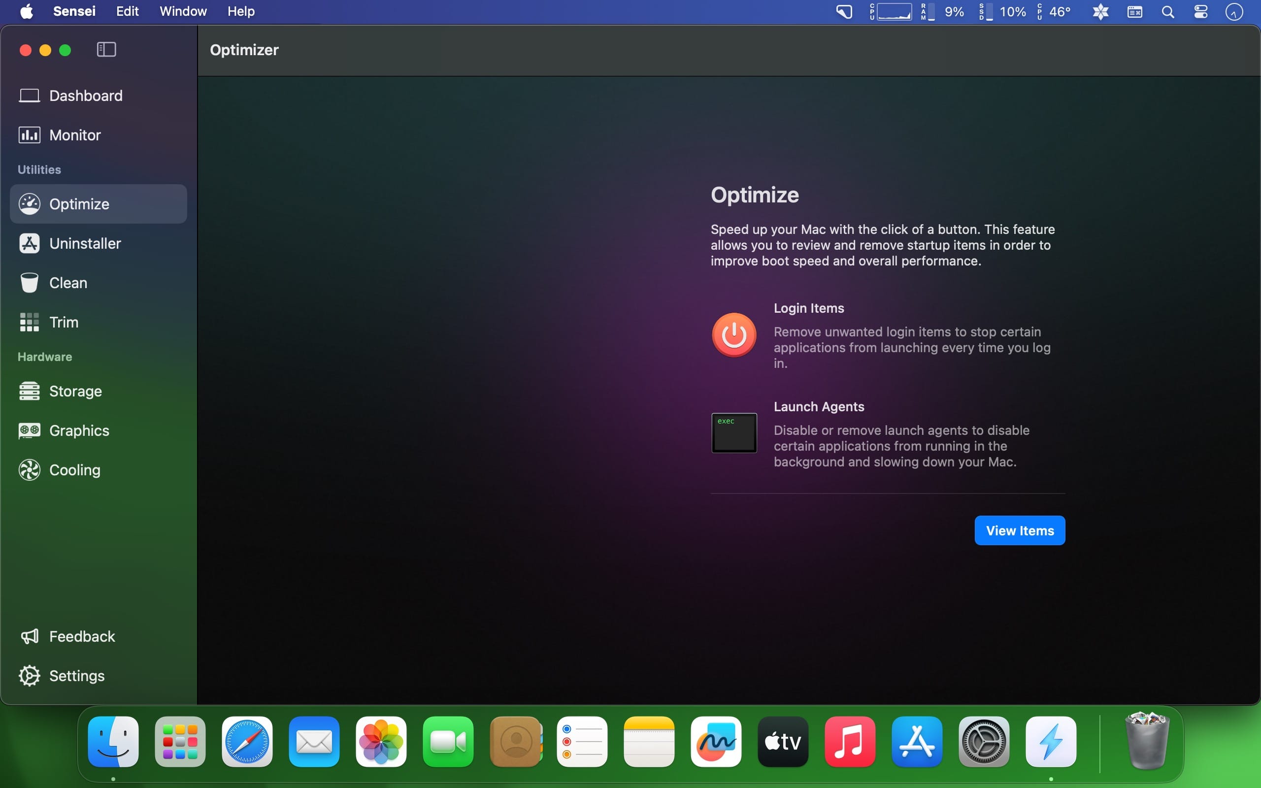 Sensei - это приложение, которое охватывает как программное, так и аппаратное обеспечение, включая гораздо больше функций, чем другие приложения в категории оптимизации Mac. Он включает в себя функции для очистки вашего диска, удаления приложений, анализа состояния аккумулятора и диска, мониторинга статистики CPU/GPU/RAM, оптимизации скорости загрузки и многое другое.