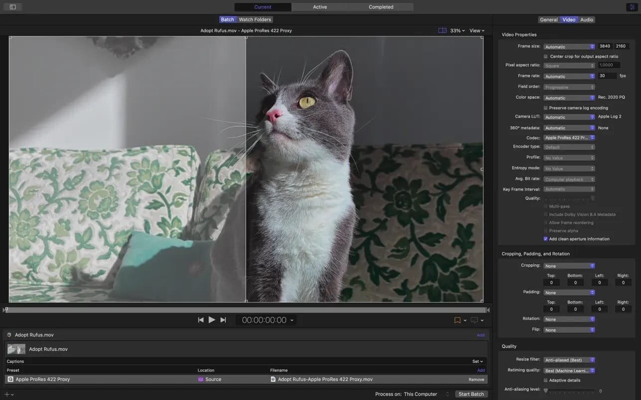 - Конвертируйте медиафайлы ProRes RAW и ProRes RAW HQ в другие профессиональные форматы файлов.