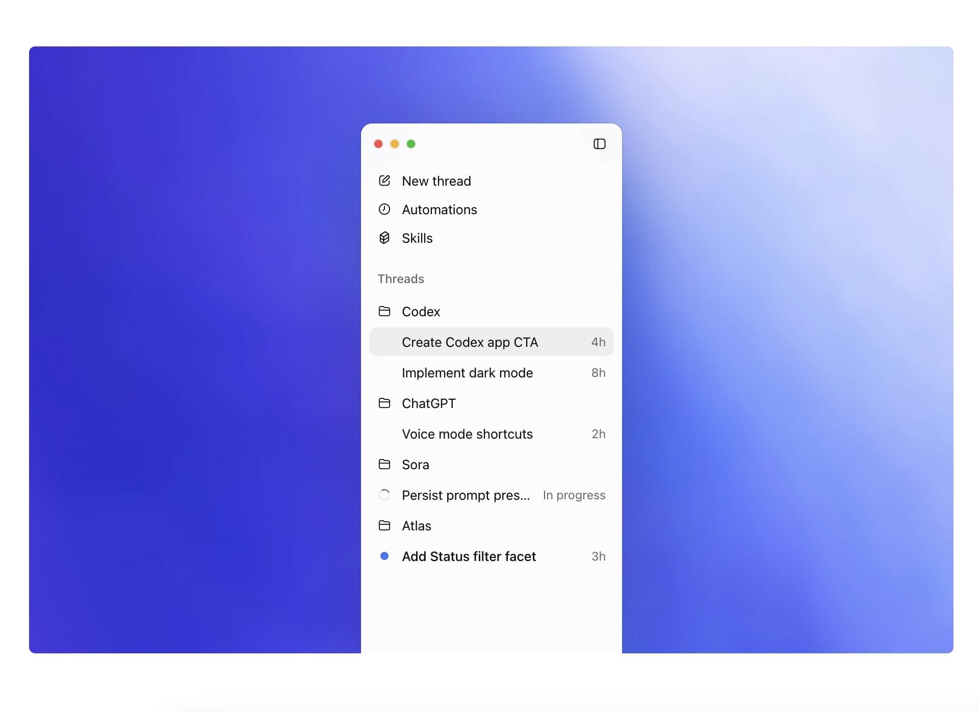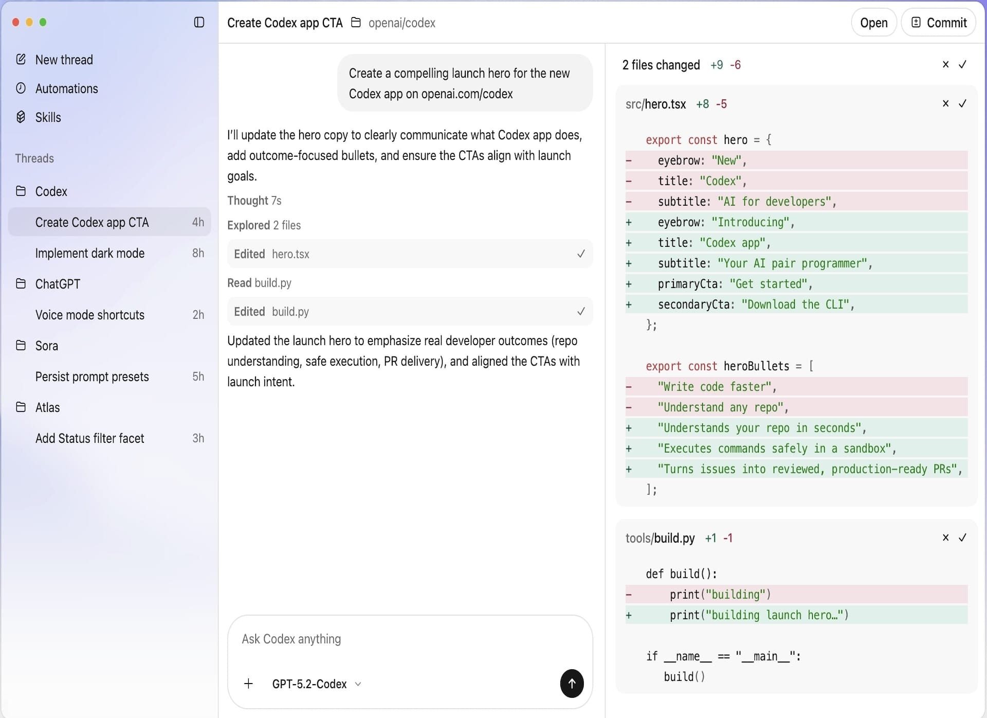 Приложение Codex организовано по проектам и отображает контекст и прогресс каждого потока агента, поэтому вы можете мгновенно переключаться между ними, не теряя нить, и при этом сохранять контроль благодаря просматриваемым различиям, встроенным инструментам Git и рабочим веткам для изоляции изменений.