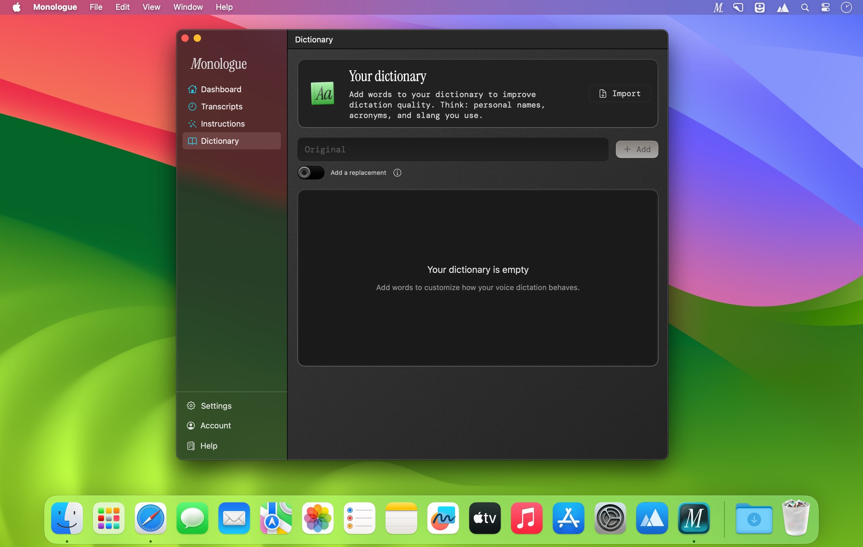 Monologue работает как самостоятельное приложение, позволяя диктовать текст в любой программе без лишних сложностей.