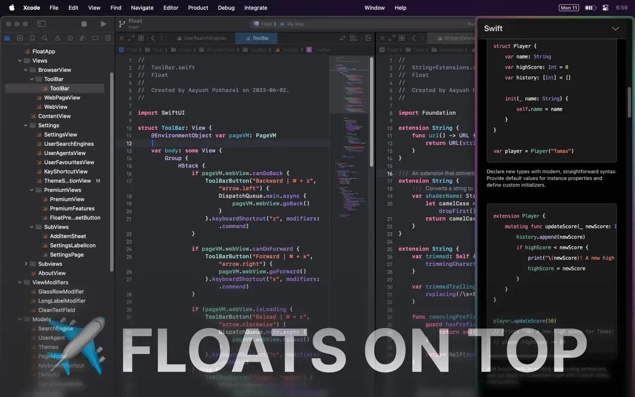 Float — минималистичный веб-браузер, который работает в плавающем окне поверх всех остальных приложений. Позволяет просматривать веб-страницы, не переключаясь из основного рабочего пространства: идеально для быстрого поиска, просмотра инструкций, видео или заметок параллельно с работой в других программах. Нативное приложение с акцентом на приватность: не собирает данные, блокирует рекламу и трекеры по умолчанию.
