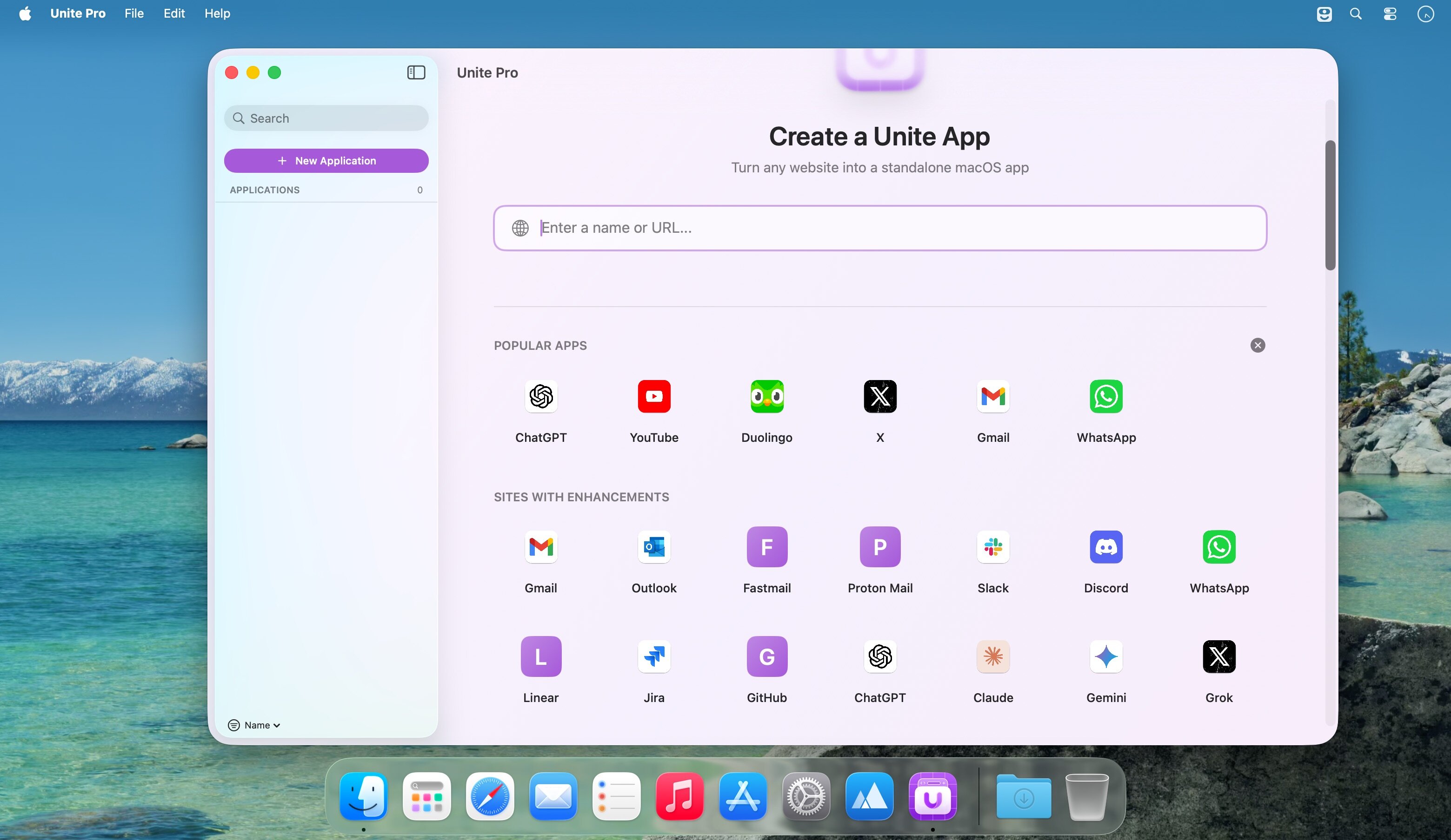 Unite для macOS превращает любой веб-сайт в нативное приложение для Mac — быстрое, настраиваемое и тесно интегрированное с macOS. Вместо того чтобы переключаться между вкладками браузера, создавайте автономные приложения, которые размещаются в Dock, используют нативные элементы управления окнами и работают как обычное программное обеспечение для Mac.